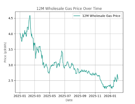 Wholesale Gas prices have fallen since 1st January 2025 due to the availability of global LNG. After relative stability toward the end of last year, market volatility has re-entered the picture over the last month due to escalations in geopolitics. The wholesale trading price during w/c 26th January 2026 deviated 0.109p/kWh, it’s most volatile week since 23rd June 2025.